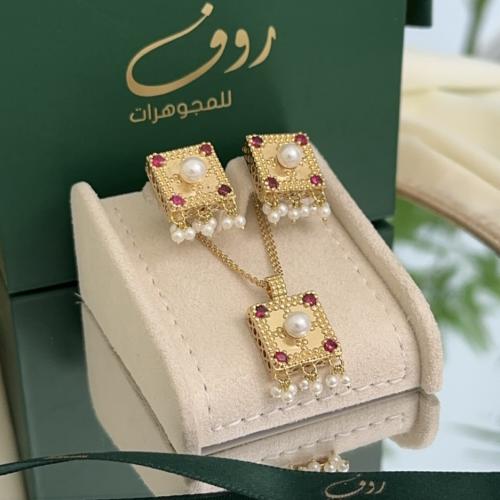 حلق وتعليقة ذهب حجر مع لولو عيار18–3747