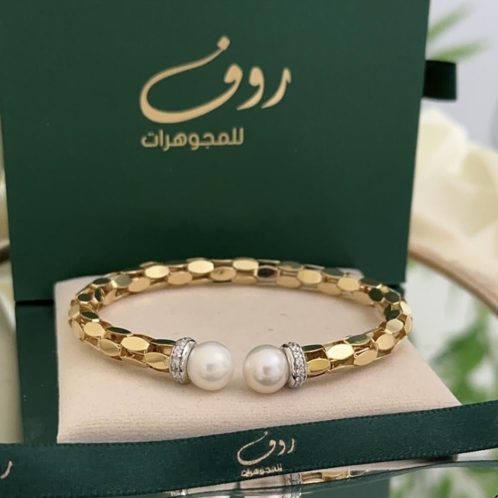 تألقي بأناقة مع سواره لولو الفاخرة من مجموعة اساور ذهب المميزة من روف للمجوهرات. تجمع هذه القطعة الاستثنائية بين جمال الذهب عيار 18 ورقي اللؤلؤ الطبيعي في تصميم عصري يناسب المرأة العصرية.