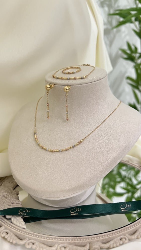 تألقي بأناقة لا مثيل لها مع طقم ذهب كامل من تشكيلة روف للمجوهرات الفاخرة. يتميز هذا الطقم الراقي بعيار 18 قيراط، ويجمع بين الأصالة والتصميم العصري ليمنحك إطلالة استثنائية في كل مناسباتك.