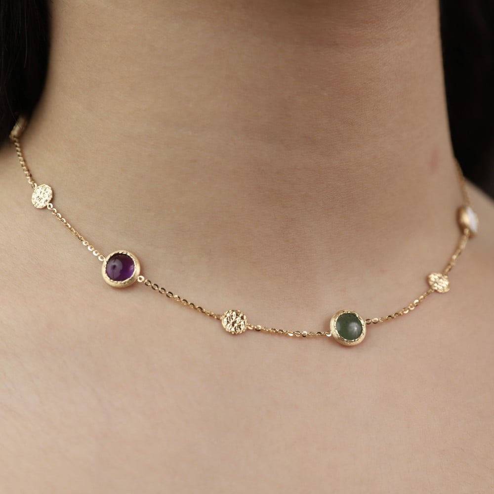 عقد(تشوكر)ذهب بأحجر كريمه(White agate Green avventurine Amethist Smoky))عيار18–4218